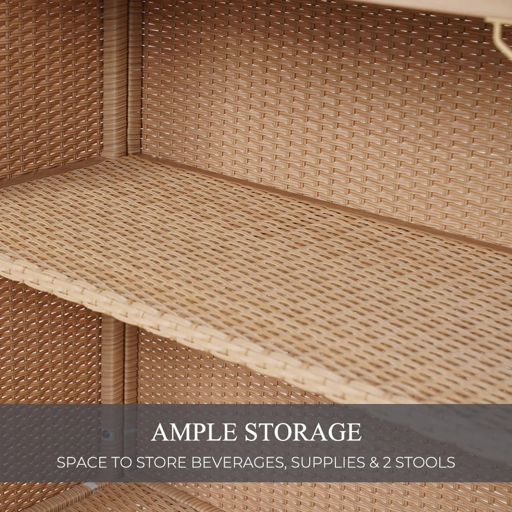 Outdoor Tiki Bar Set with Widen Ceramic Top 42 Inch W Phuket 3 Piece Wicker Islander Tiki Bar and 2 Stools Garden Storage